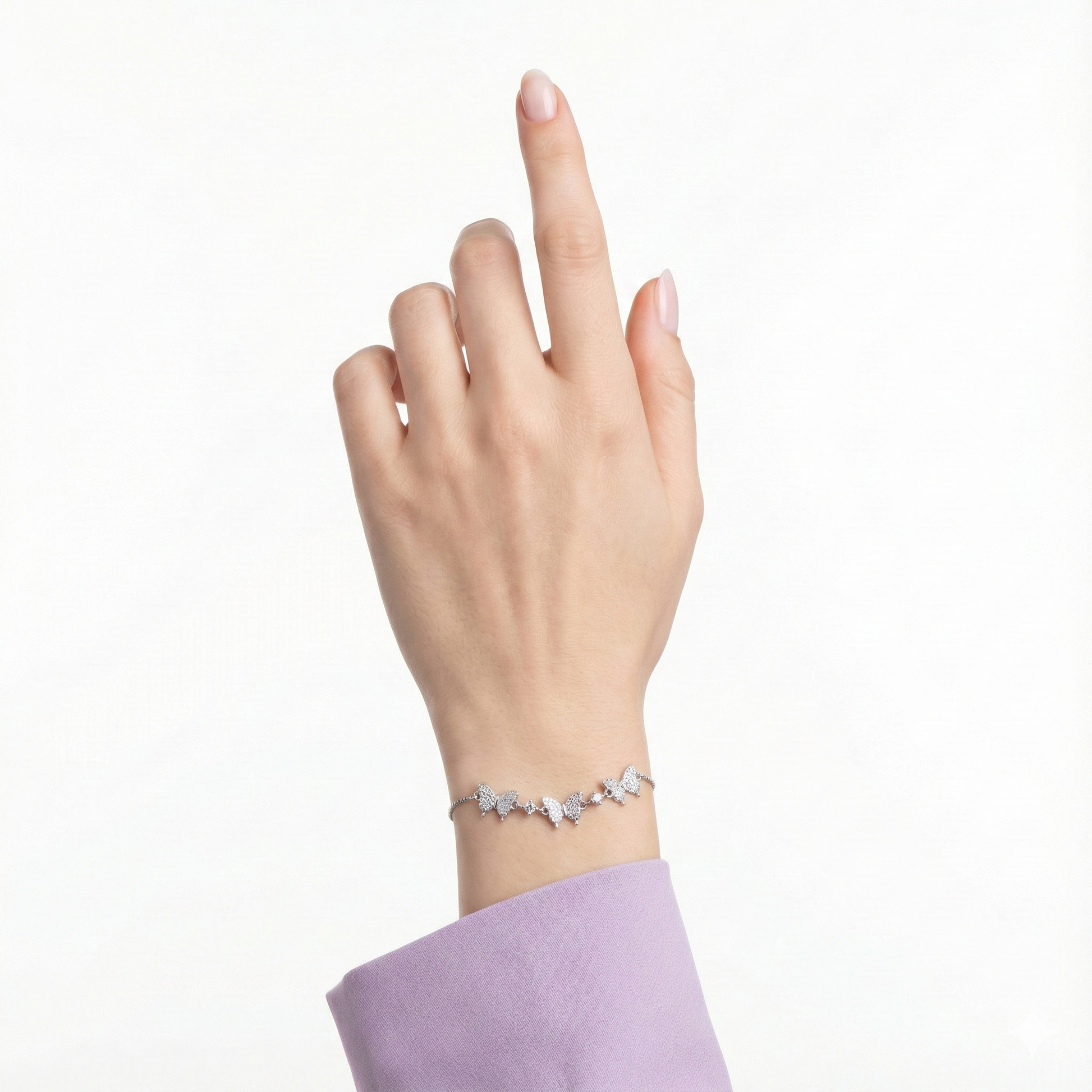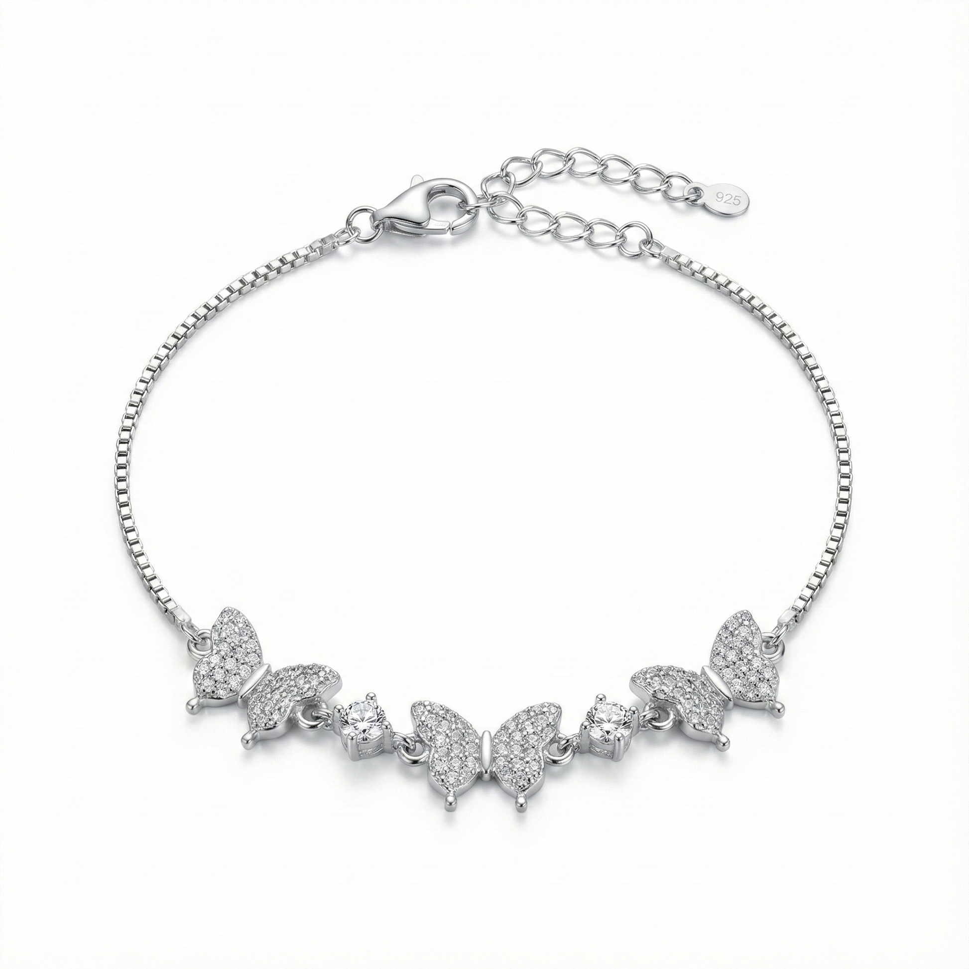 This elegant 925 silver bracelet showcases a graceful arrangement of sparkling butterfly motifs, beautifully detailed with high-shine CZ stones for a refined and luxurious finish. The symmetrical butterfly design is complemented by solitaire-style CZ connectors, creating a balanced and eye-catching look across the wrist. Crafted on a sleek silver box chain with an adjustable extension, this bracelet offers a comfortable fit for everyday wear as well as special occasions. A timeless butterfly-inspired silver bracelet that reflects femininity, elegance, and effortless charm, making it perfect for gifting or elevating your everyday style.