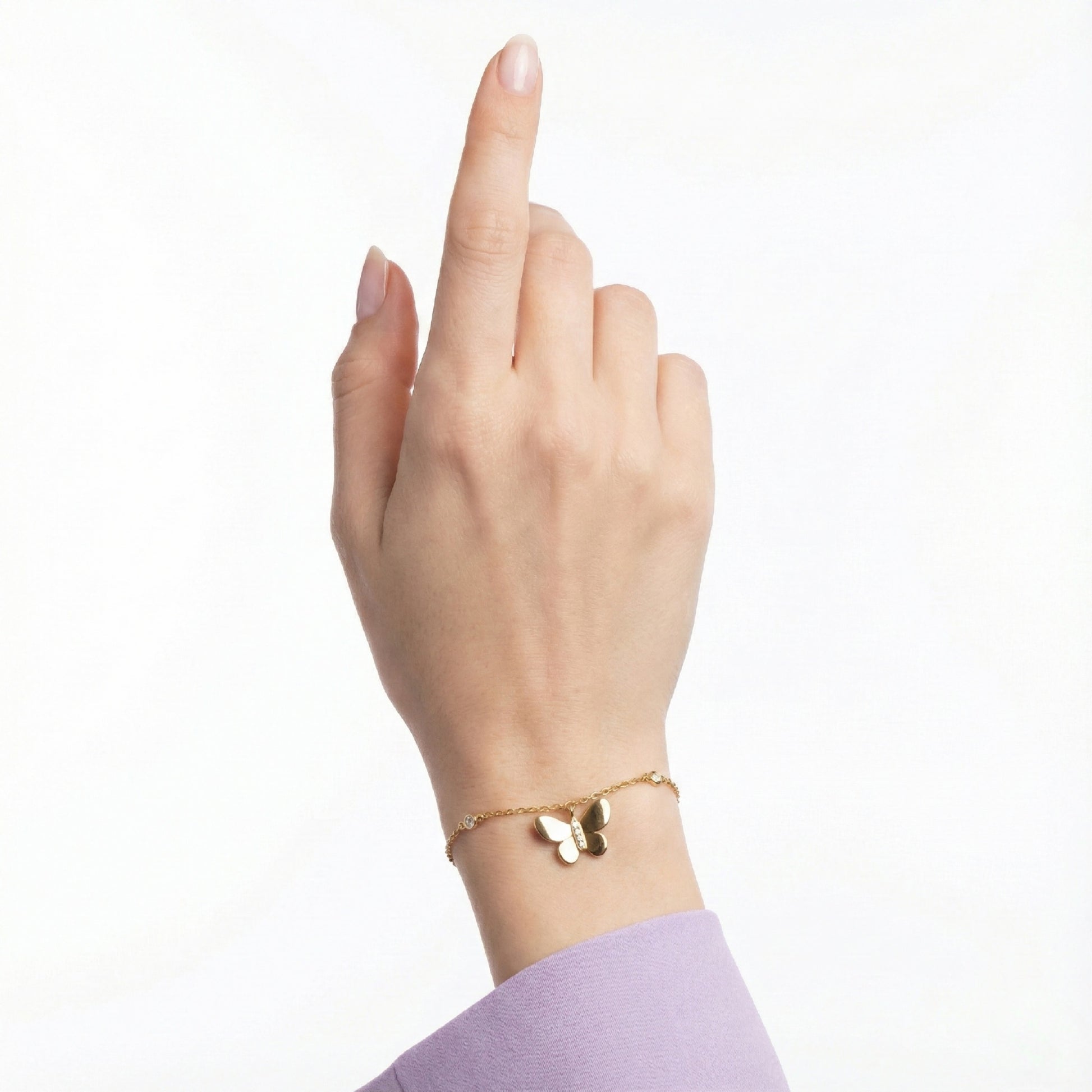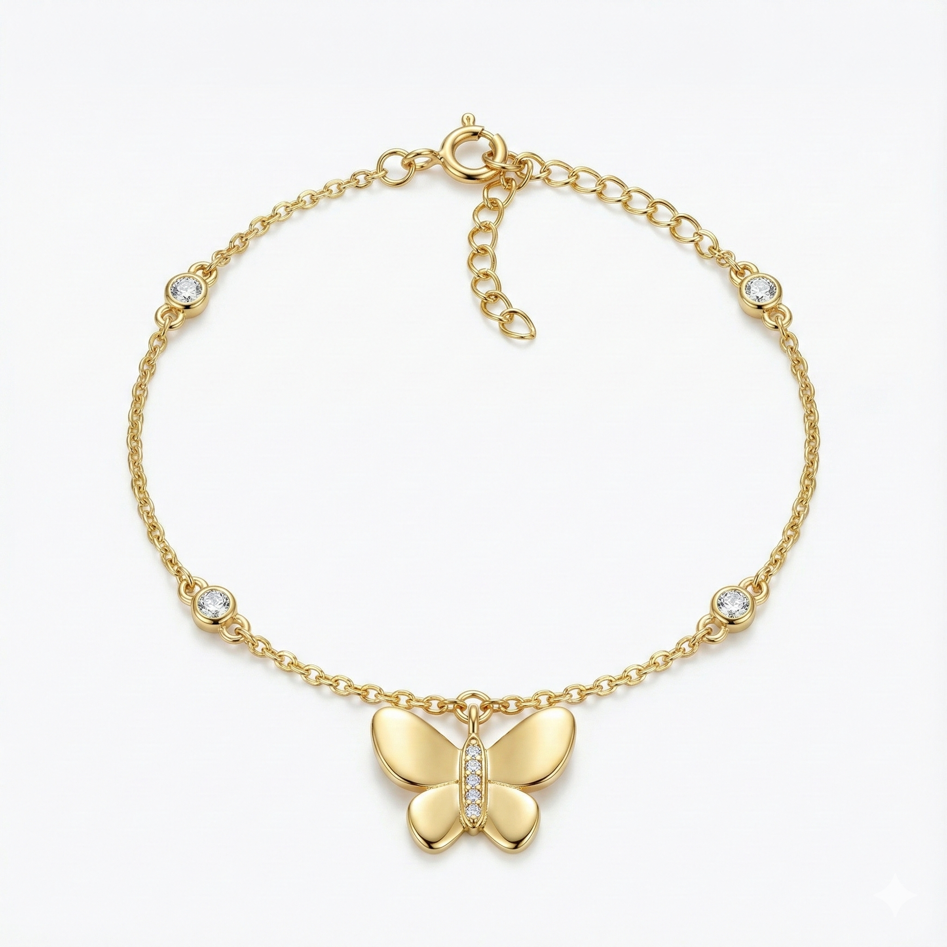 This elegant 925 silver bracelet features a beautifully crafted gold-plated butterfly charm, symbolising freedom, grace, and transformation. The sleek silver chain is enhanced with sparkling CZ stone stations that add a subtle touch of brilliance. Finished with a secure spring-ring clasp and an adjustable extension chain, this bracelet offers a comfortable and flexible fit for everyday wear. The warm gold tone paired with delicate detailing makes it perfect for daily styling, special occasions, and thoughtful gifting. A timeless butterfly bracelet designed for those who love minimal luxury with meaningful design.
