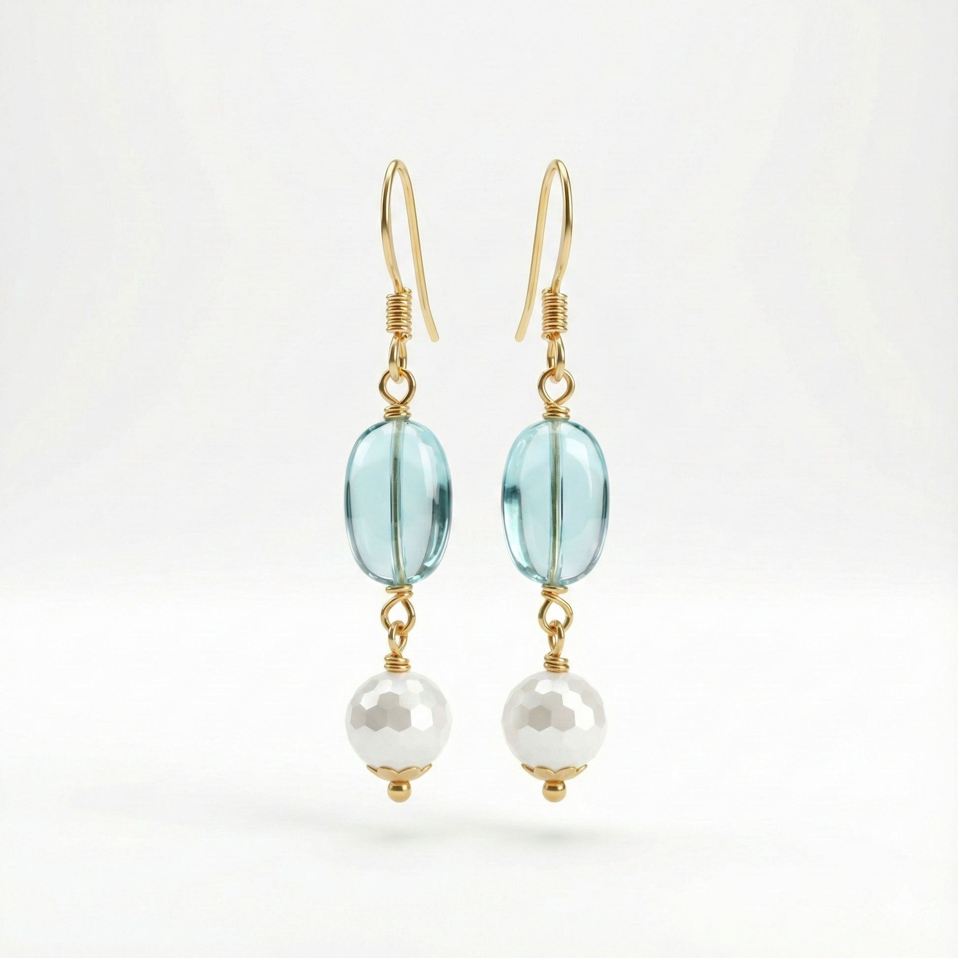 2️⃣ The Design: These delicate, elongated drop earrings hang from simple gold-toned fish hooks. The main element is a polished, translucent oval bead in a soft, clearlight bluehue (likely Blue Topaz or Aquamarine), which is separated from the lower element by a simple gold-toned connector. The bottom element is a roundwhite pearl, featuring a faceted surface for extra texture and secured by a small gold bead cap.