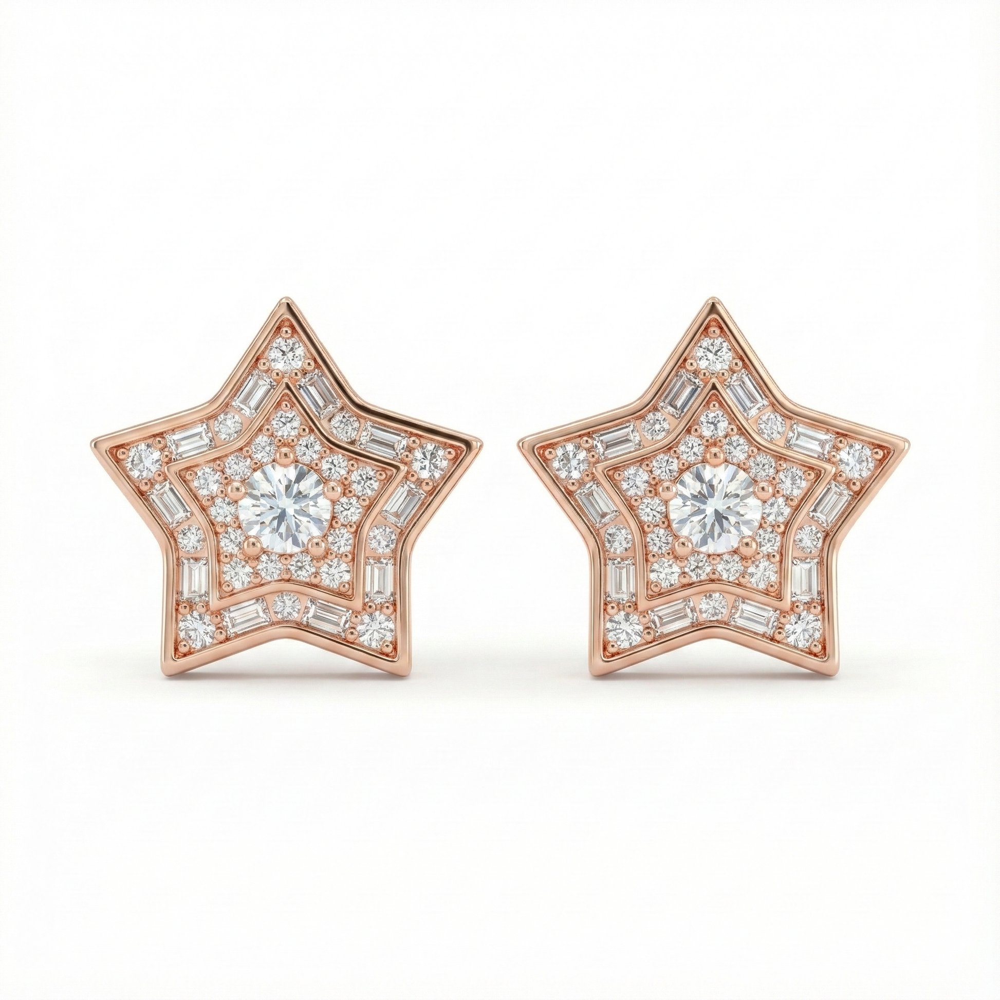 2️⃣ The Design: These striking stud earrings are shaped like a beautiful five-pointed star and feature a rich rose gold-tone finish. A brilliant round-cut stone sits at the center, surrounded by a pave-set halo. The remainder of the star's surface is intricately filled with alternating clear baguette and round-cut stones, creating a magnificent starburst effect that maximizes shine and dimension.