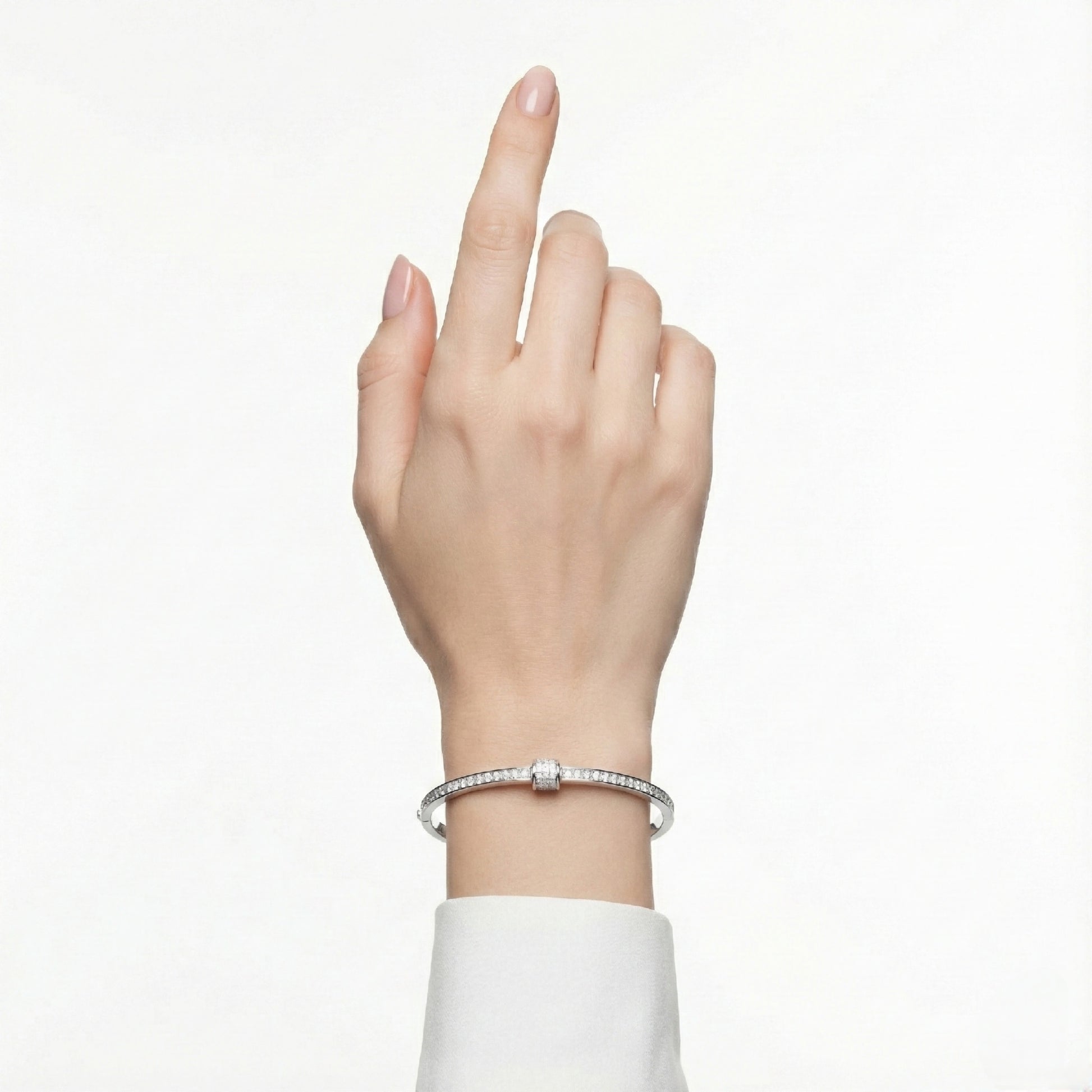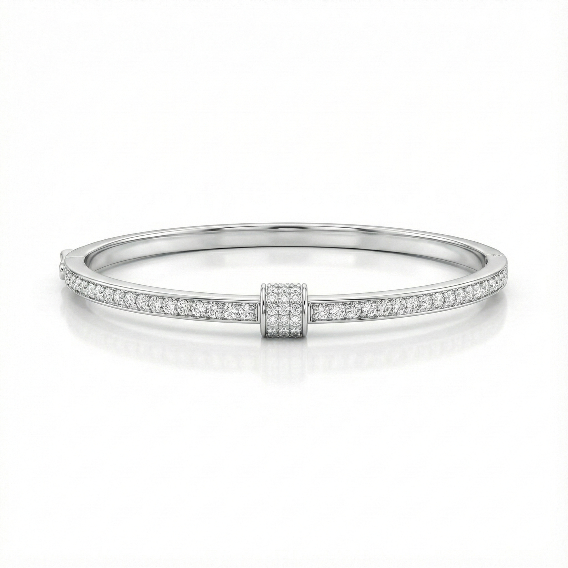 This elegant 925 silver closed bangle features a timeless circular design highlighted with a continuous line of sparkling diamonds and a refined central diamond-studded accent. Crafted for a perfect fixed fit, this bangle offers a clean, symmetrical look that feels luxurious yet minimal. The high-polish finish enhances the brilliance of the stones, making it an ideal choice for everyday elegance as well as special occasions. A classic silver bangle that pairs effortlessly with both traditional and modern outfits, adding understated sophistication to your jewelry collection.