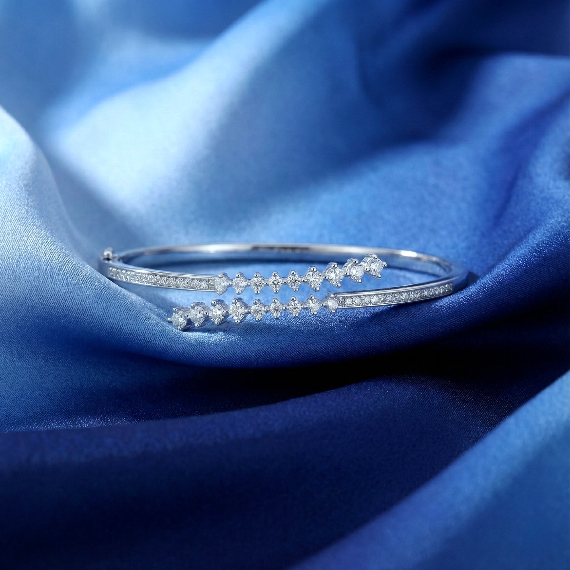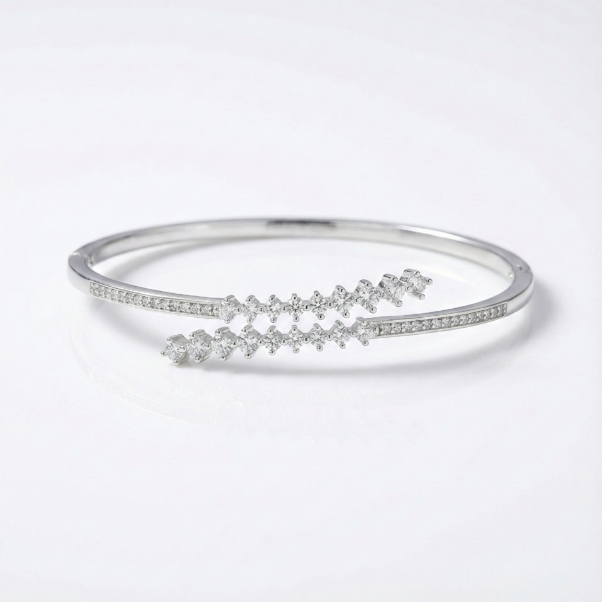 This elegant 925 silver adjustable cuff bracelet features two sparkling diamond-studded lines that blend modern finesse with timeless charm. Designed with an open-front structure, it offers a flexible and comfortable fit for various wrist sizes. The slim sterling silver frame and delicately arranged stones create a graceful, elongated look on the wrist. Perfect for everyday elegance or special occasions, this bracelet adds a refined sparkle to any style.