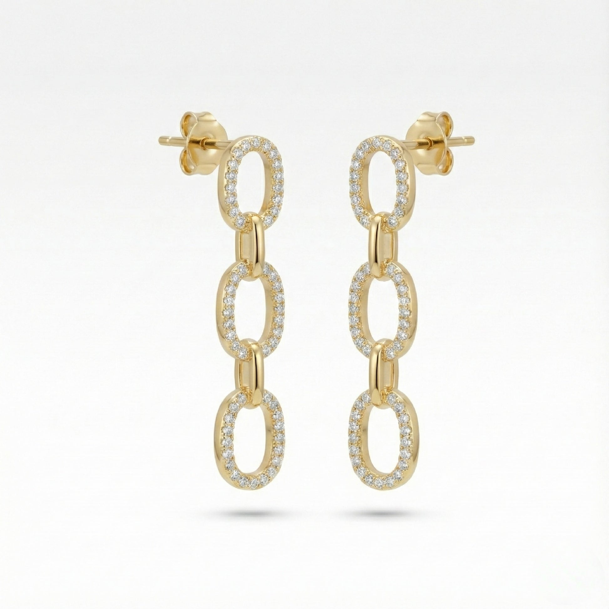 2️⃣ The Design: These stylish drop earrings feature a series of three interconnected oval links, creating a chic, linear design. Each of the oval links is beautifully adorned with a continuous line of small, sparkling pave-set stones, maximizing their brilliance. The links are joined by smooth, polishedgold-tonedconnectors, and the earrings secure with a classic stud post closure.