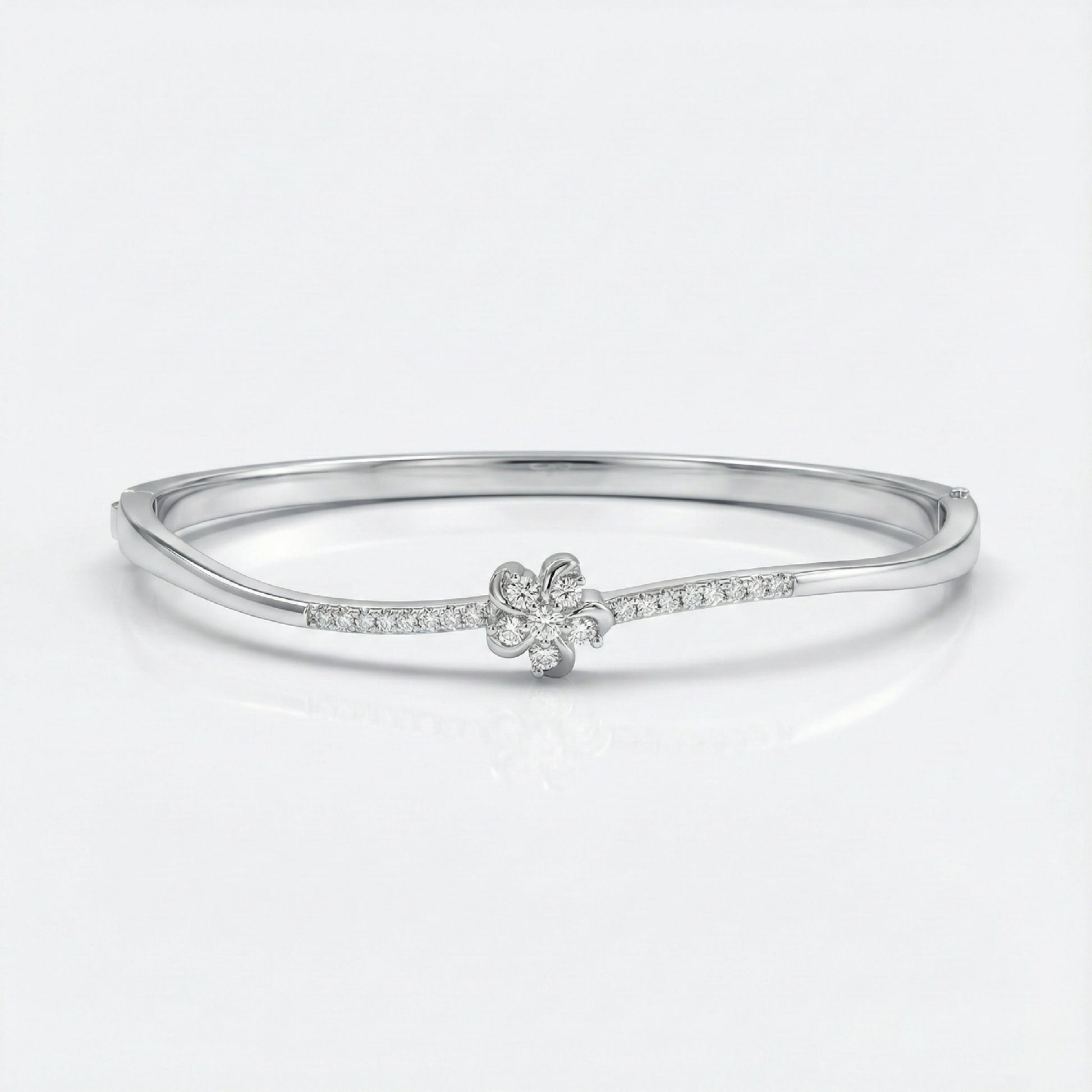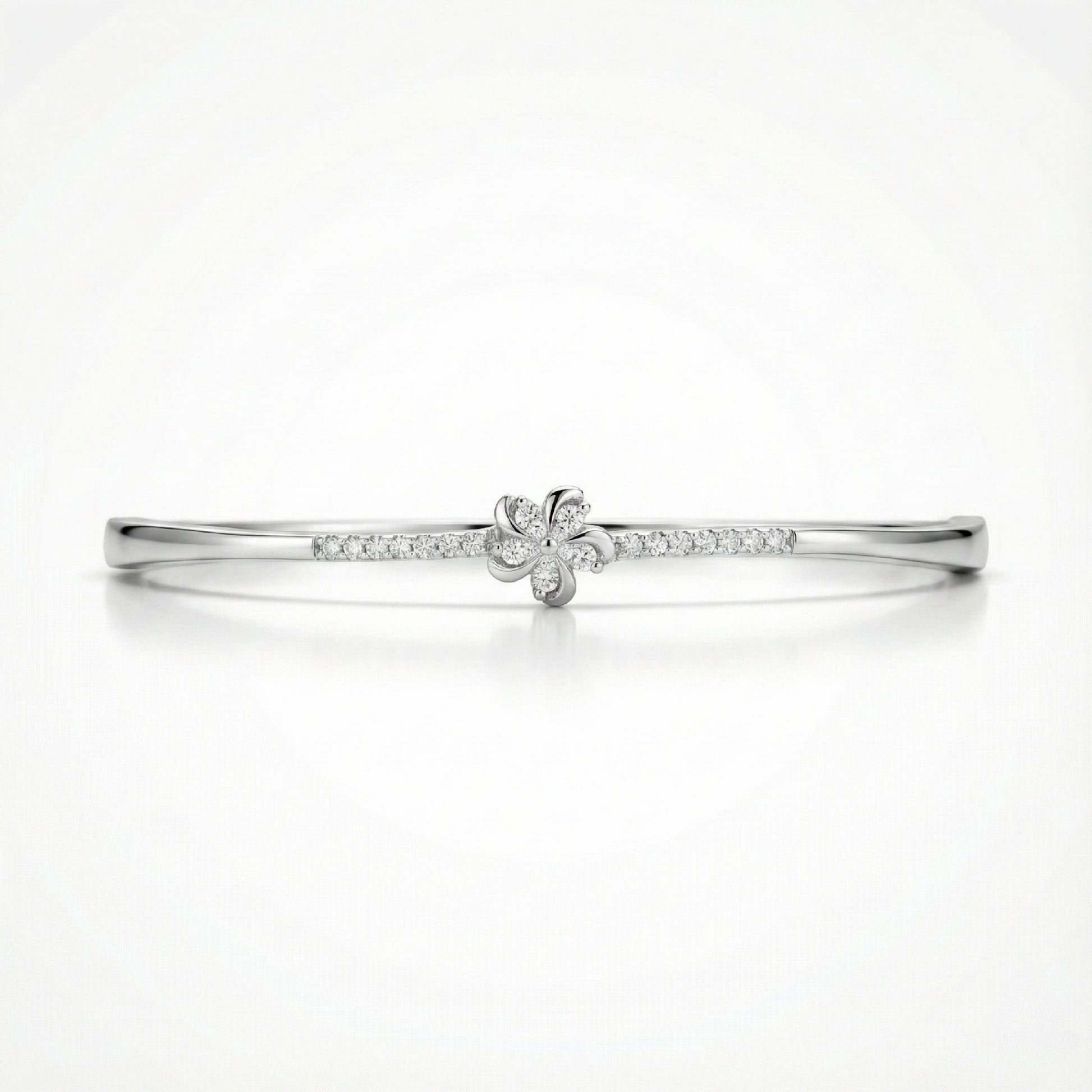 This graceful 925 silver closed bangle is designed with a delicate floral diamond accent at the center, paired with subtle diamond detailing along the band. The slim, polished silver structure gives it a refined and elegant look, perfect for women who prefer minimal yet luxurious jewelry. Crafted for a fixed, comfortable fit, this bangle sits beautifully on the wrist and adds a soft sparkle without being overpowering. Ideal for daily wear, office looks, festive styling, or gifting, this floral silver bangle blends timeless charm with modern simplicity.