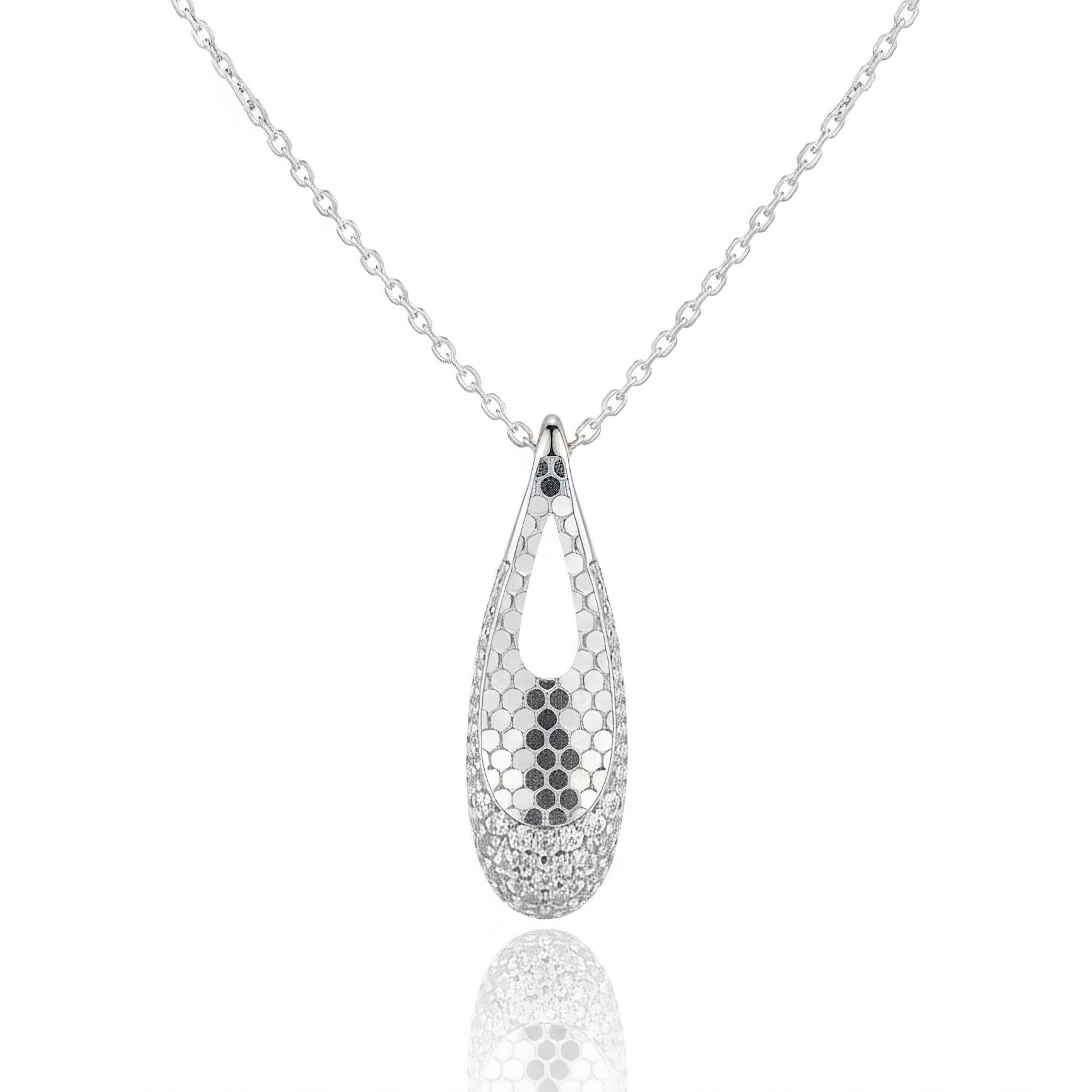 This striking minimal pendant design features a contemporary teardrop silhouette, meticulously crafted from genuine 92.5 sterling silver. The upper section of the pendant showcases intricate handcrafted silver jewelry work with a delicate honeycomb open-work pattern, creating a captivating interplay of light and shadow. The base curves into a brilliant flourish, pave-set with numerous sparkling Cubic Zirconia stones for a touch of refined glamour. Finished with a durable rhodium plating for lasting shine, this sterling silver necklace comes complete with an adjustable 16" + 2" cable chain, making this a truly versatile 92.5 silver pendant set.