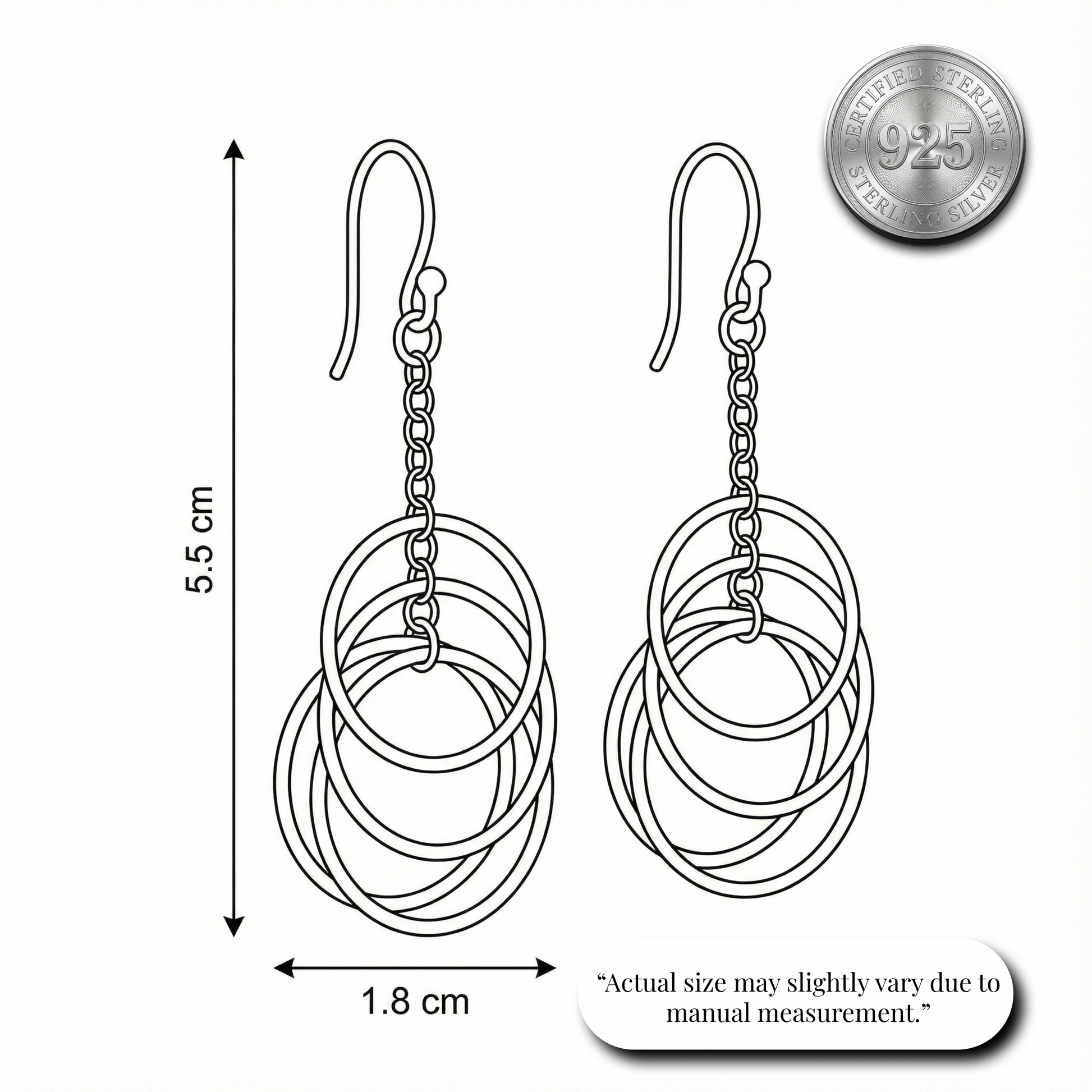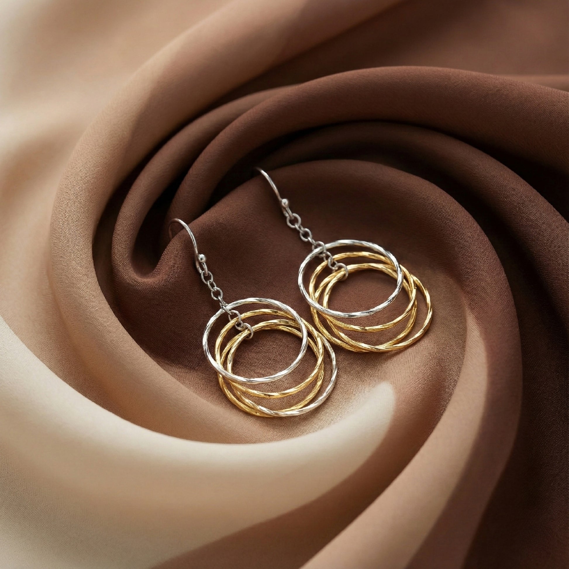 2️⃣ The Design: These striking drop earrings feature a playful cluster of five interconnected rings suspended from a delicate silver chain and a polished silver fish hook. Two of the rings have a bright silver tone, and three have a warm gold tone. All the rings showcase a unique textured or hammered finish, catching the light beautifully as they move. The intertwined circles create a bold, yet lightweight, statement.