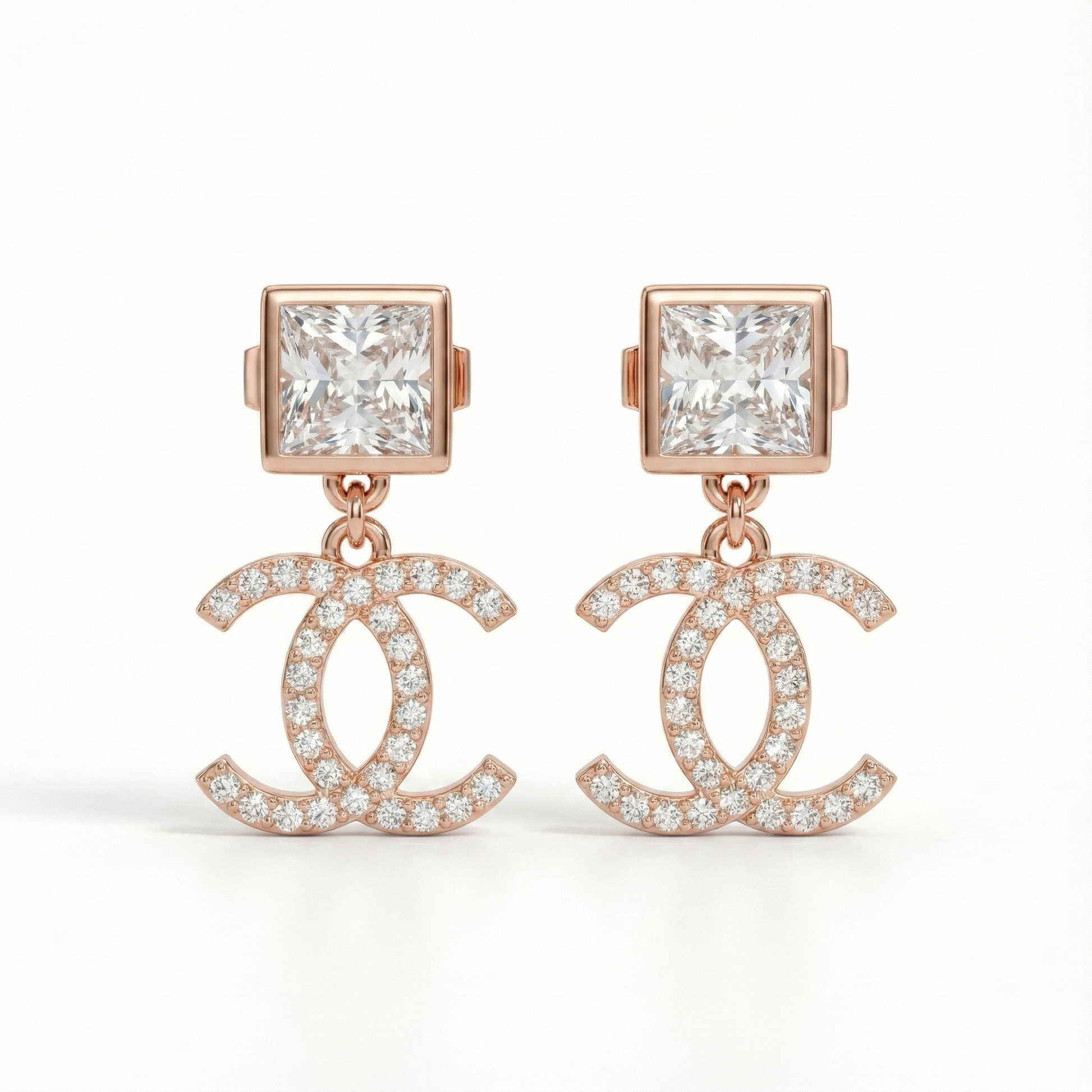 2️⃣ The Design: These striking drop earrings are set in a warmrose gold-tonefinish. They feature a top stud with a single, square-cut (princess-cut) clear stone, securely bezel-set. Suspended from this stud is a bold, recognizable interlocking double-C motif, which is completely covered with a dense pave setting of small, brilliant clear stones, maximizing the sparkle and creating a sophisticated, branded look.