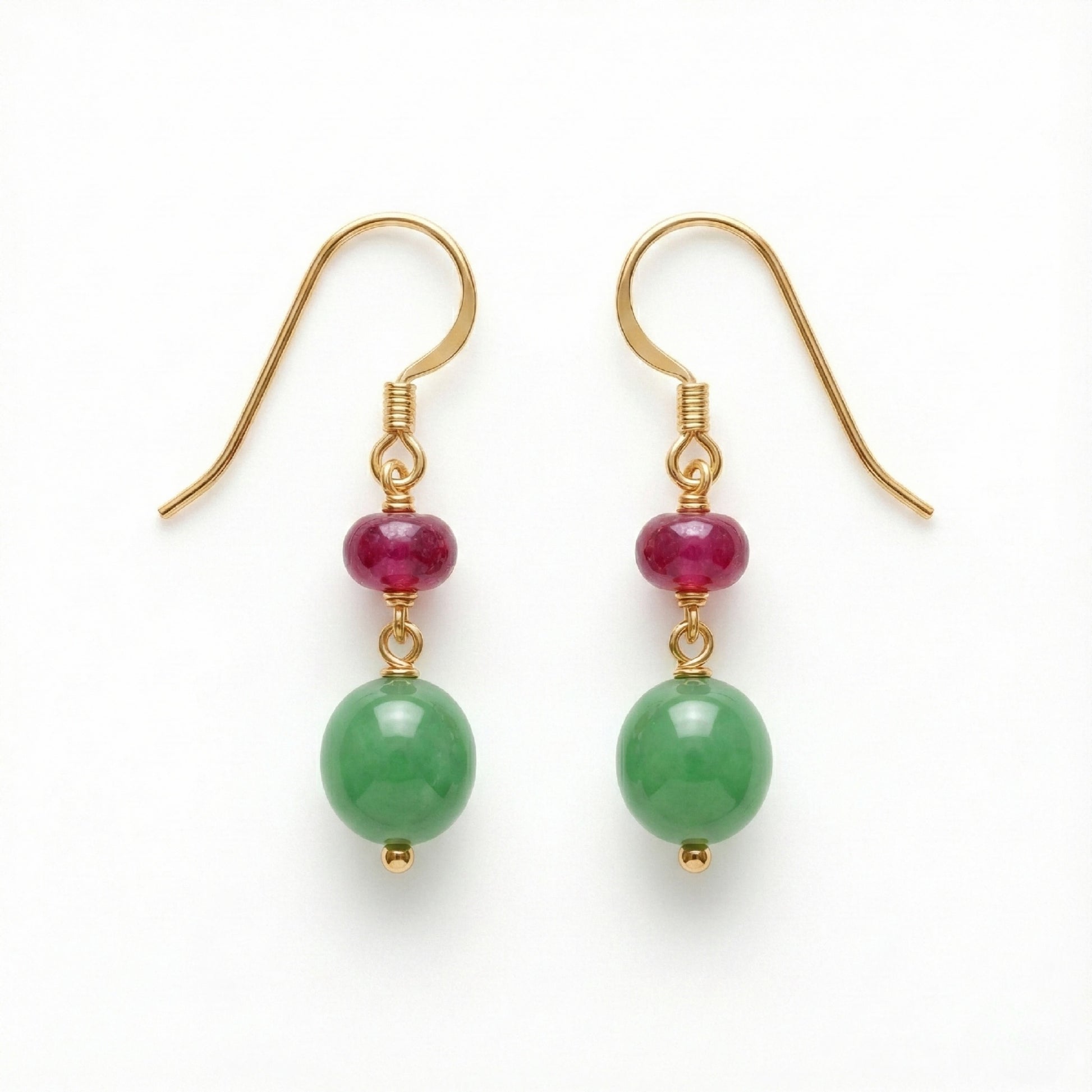 2️⃣ The Design: These delicate drop earrings feature a simple gold-toned fish hook. Suspended from the hook are two smooth, polished bead-shaped gemstones. The top gemstone is a rich pink/ruby hue, and the bottom gemstone is a vibrant green (likely jade or agate). The beads are separated by small gold-toned spacers, creating a vibrant, yet minimalist, contrast of natural colors.