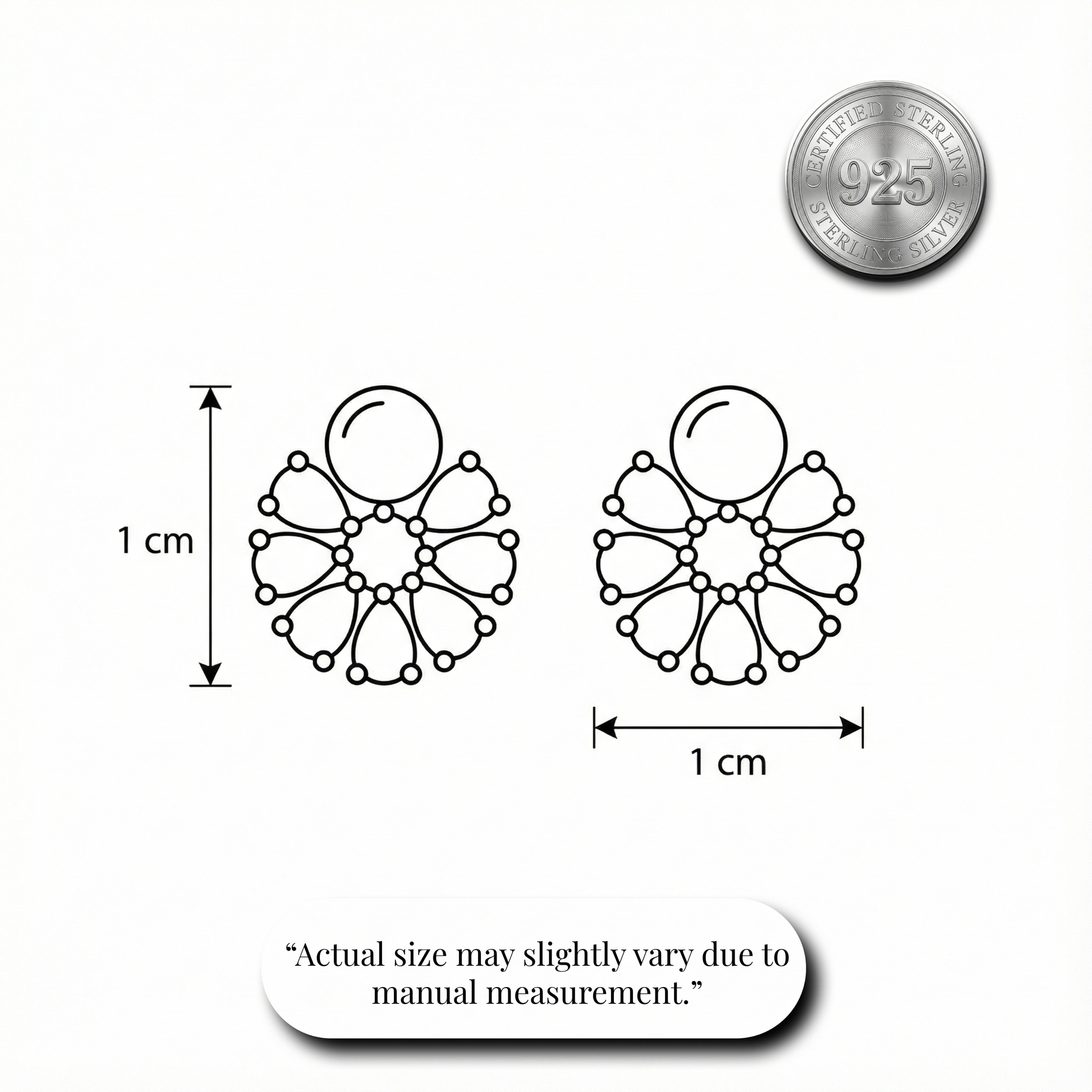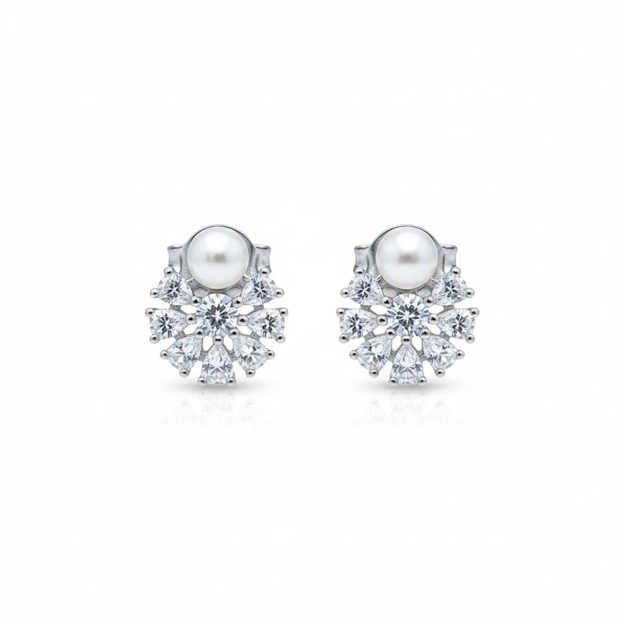 2️⃣ The Design: These exquisite stud earrings feature a beautiful flower-like cluster design. The center of the 'flower' holds a brilliant, round clear stone, from which six clear, pear-shaped stones radiate outwards like petals. Directly above the flower motif, a single, smooth, lustrousround pearlis set, combining the sparkle of the clear stones with the classic elegance of the pearl. The entire setting is in a polished silver finish.