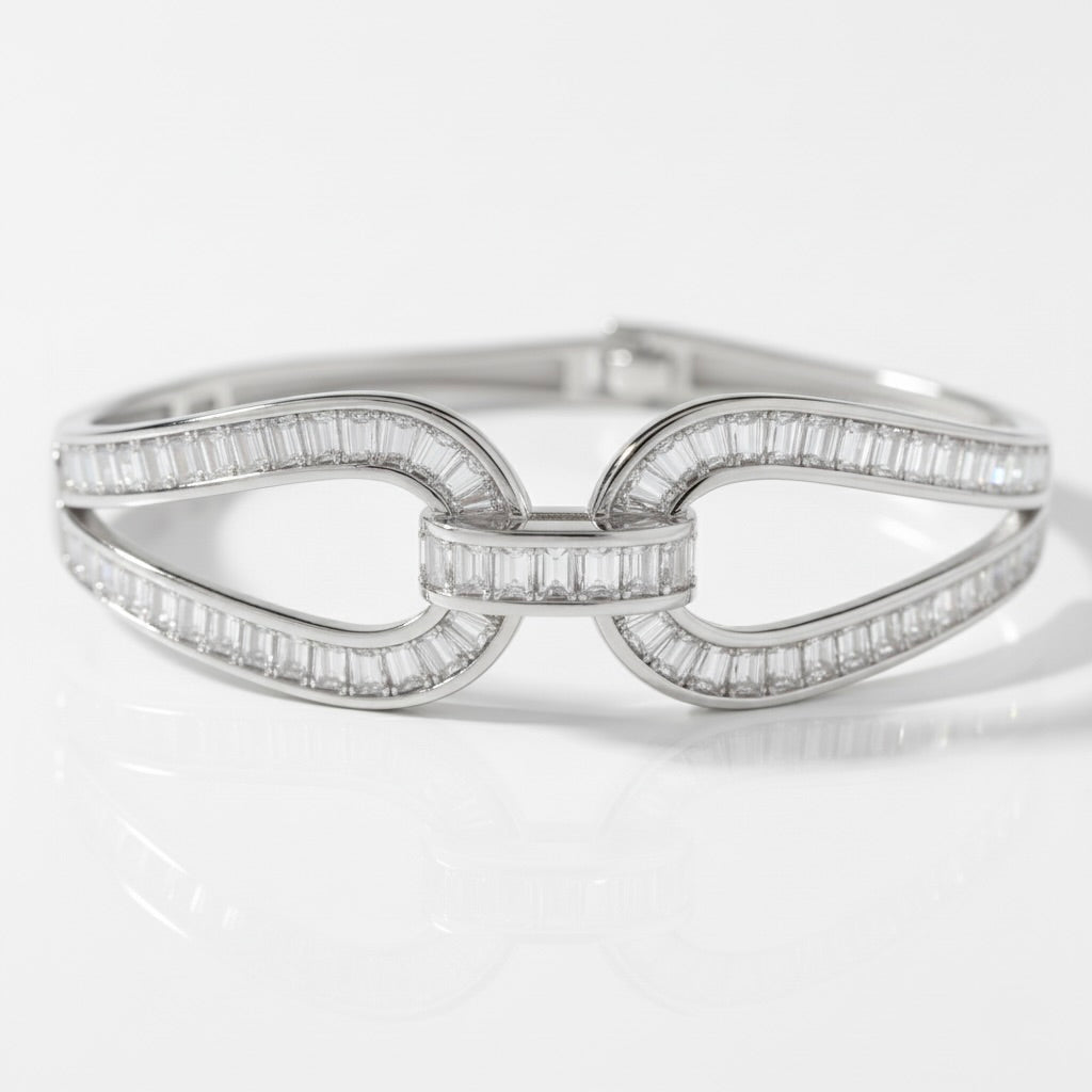 This luxurious 925 silver fixed bangle features a striking twin-curve openwork design highlighted with elegant baguette diamond-style stones. The symmetrical flowing lines create a bold yet refined statement, while the precision-set stones add brilliant sparkle from every angle. Crafted with a secure hinged clasp, this bangle offers comfort, durability, and a flawless structured fit. Ideal for festive occasions, evening wear, and premium gifting, this silver bangle blends modern artistry with timeless elegance, making it a standout addition to any sophisticated jewelry collection.