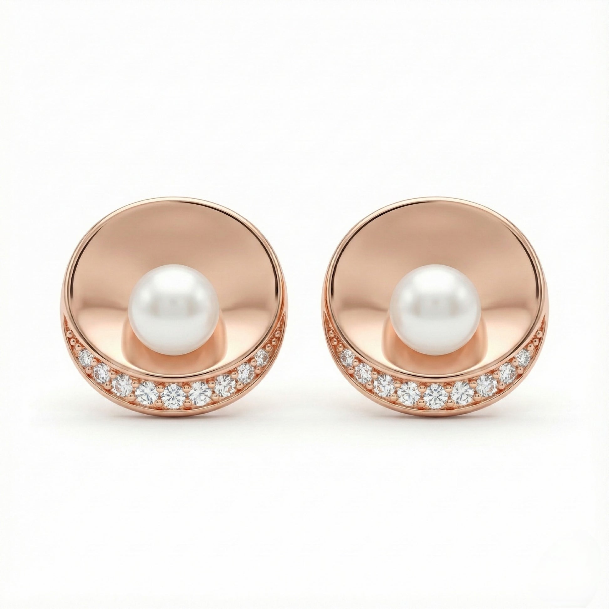 2️⃣ The Design: These exquisite stud earrings feature a beautiful, convex circular disc with a warmrose gold-tonefinish. Nestled precisely in the center of the disc is a single, lustrouswhite round pearl. The lower half of the surrounding disc is elegantly accented with a curving row of small, sparkling pave-set stones, highlighting the pearl like a crescent moon.