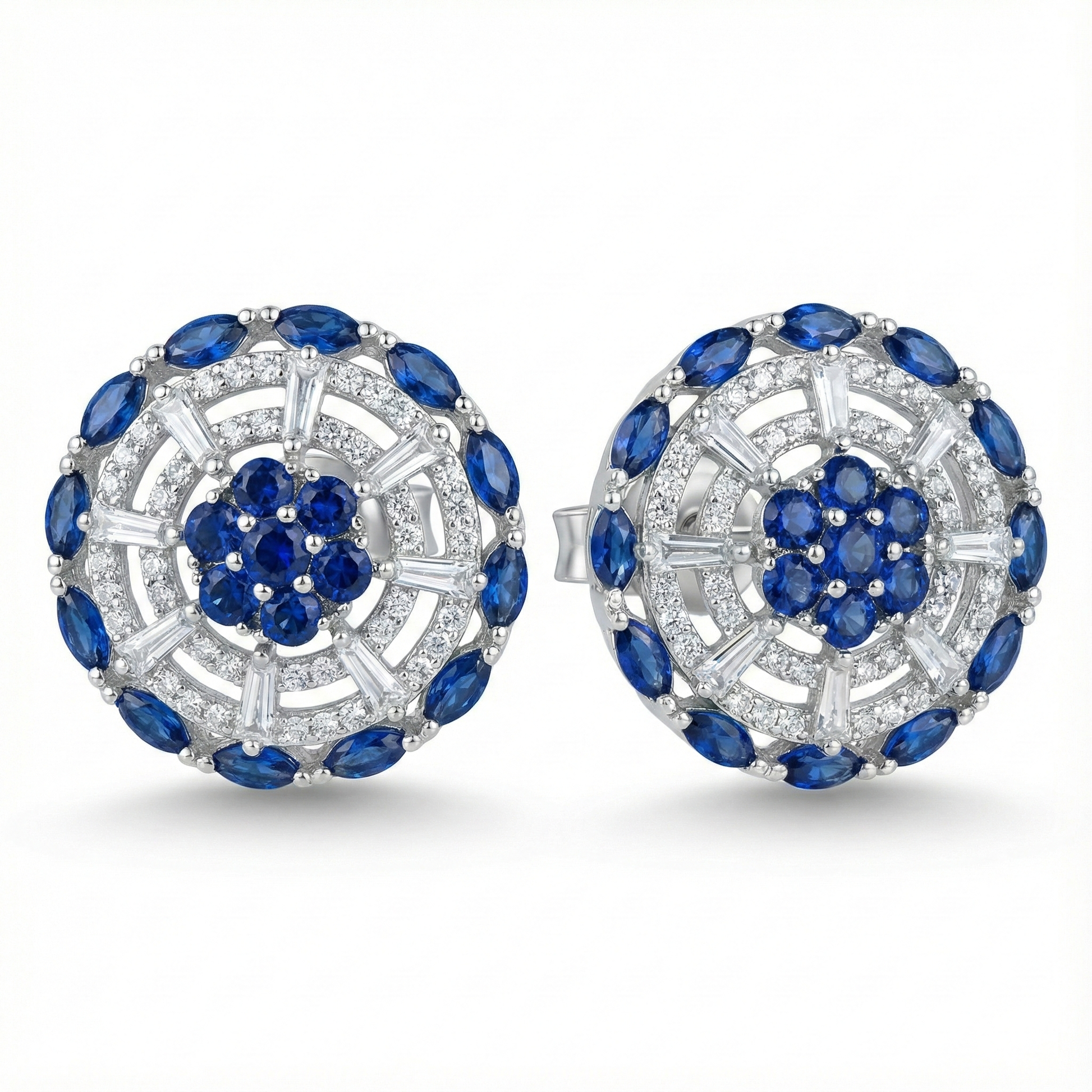 2️⃣ The Design: These elaborate circular stud earrings feature a stunning central cluster of deep blue oval-shaped stones, forming a delicate floral motif. Surrounding this flower, the design consists of concentric circles adorned with a mix of clear rectangular (baguette) stones and small pave-set stones, creating a brilliant, radiating spoke effect. The outer rim is beautifully finished with a circle of dazzling blue marquise-cut stones, completing the opulent, layered look.