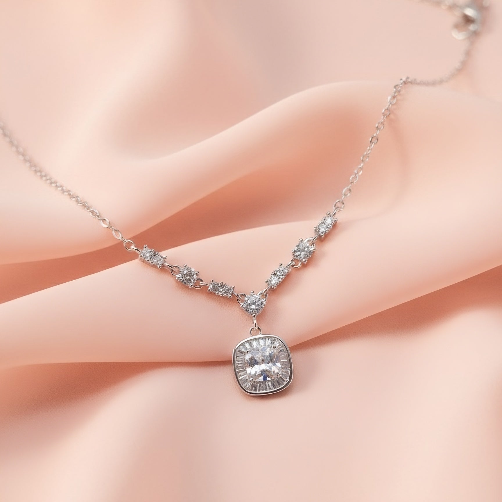 Introducing the 'Starlight' 92.5 silver pendant set, a masterpiece of handcrafted silver jewelry that defines minimal luxury. The central feature is an exquisite cushion-cut stone look surrounded by a dazzling square halo of precisely set baguette and round stones. This radiant drop hangs delicately from a finely crafted 92.5 sterling silver chain. The chain itself features a graceful, minimal pendant design with a V-shaped arrangement of glittering clusters, adding a subtle cascade of sparkle. Finished with a high-polish rhodium plating for lasting luster, this sterling silver necklace comes with a versatile 16" chain plus a 2-inch adjuster, ensuring the perfect fit and drape at the collarbone.