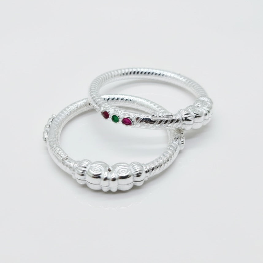A classic set of kadas for kids, crafted from pure 92.5 sterling silver. These bangles feature beautiful traditional embossed patterns and are adorned with small red and green crystals. They're hypoallergenic and a timeless piece for any special occasion or celebration.