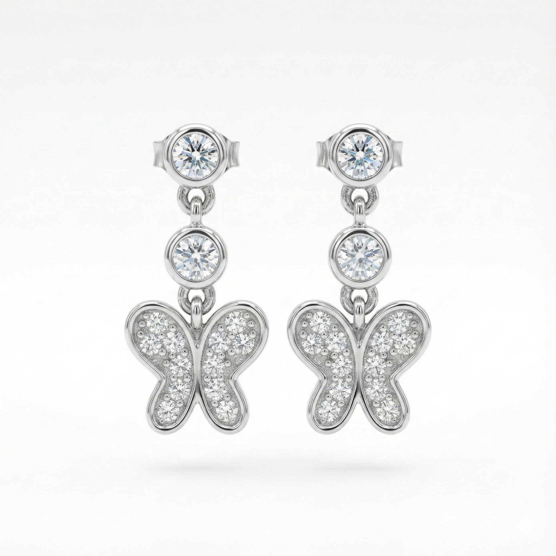2️⃣ The Design: These beautiful drop earrings feature a top stud and a chain formed by three round, brilliant-cut stones, each individually bezel-set and linked together. Suspended at the bottom is a charming butterfly motif. The butterfly's wings are entirely covered in a dense pave setting of small, clear stones, creating a full and dazzling sparkle.