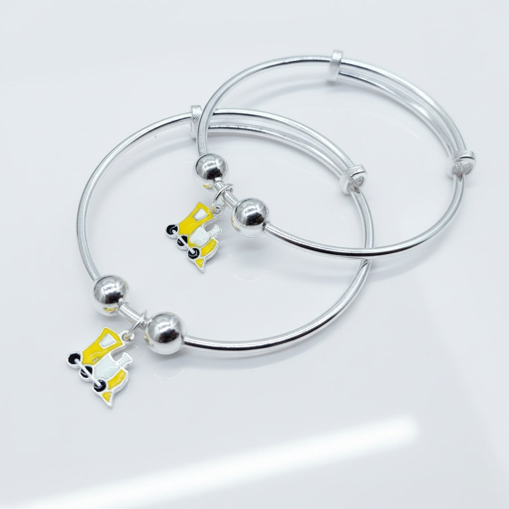 A playful set of kadas for kids, crafted from pure 92.5 sterling silver. These adjustable bangles feature a charming yellow enamel car charm, making them a fun accessory for any little adventurer. They're hypoallergenic and can be easily adjusted to fit a child's wrist perfectly.