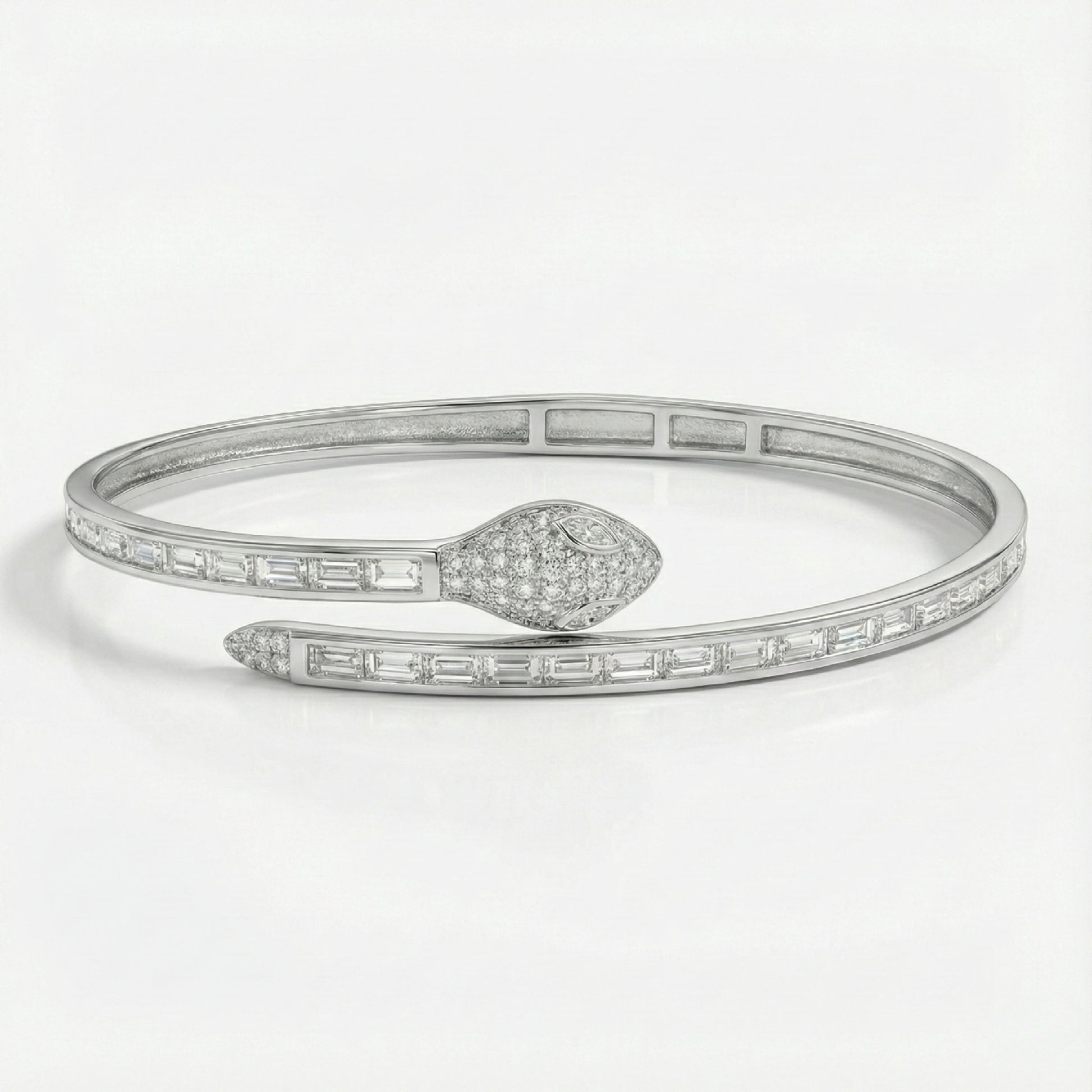 This luxurious 925 silver snake-style bangle features a sleek, open-wrap design that offers a comfortable adjustable fit for any wrist size. The bangle is lined with sparkling baguette-cut stones, while the snake head is embellished with pavé diamonds for an elegant, high-jewelry look. Its modern yet timeless silhouette makes it a statement piece that stands out effortlessly, perfect for both everyday style and special occasions.