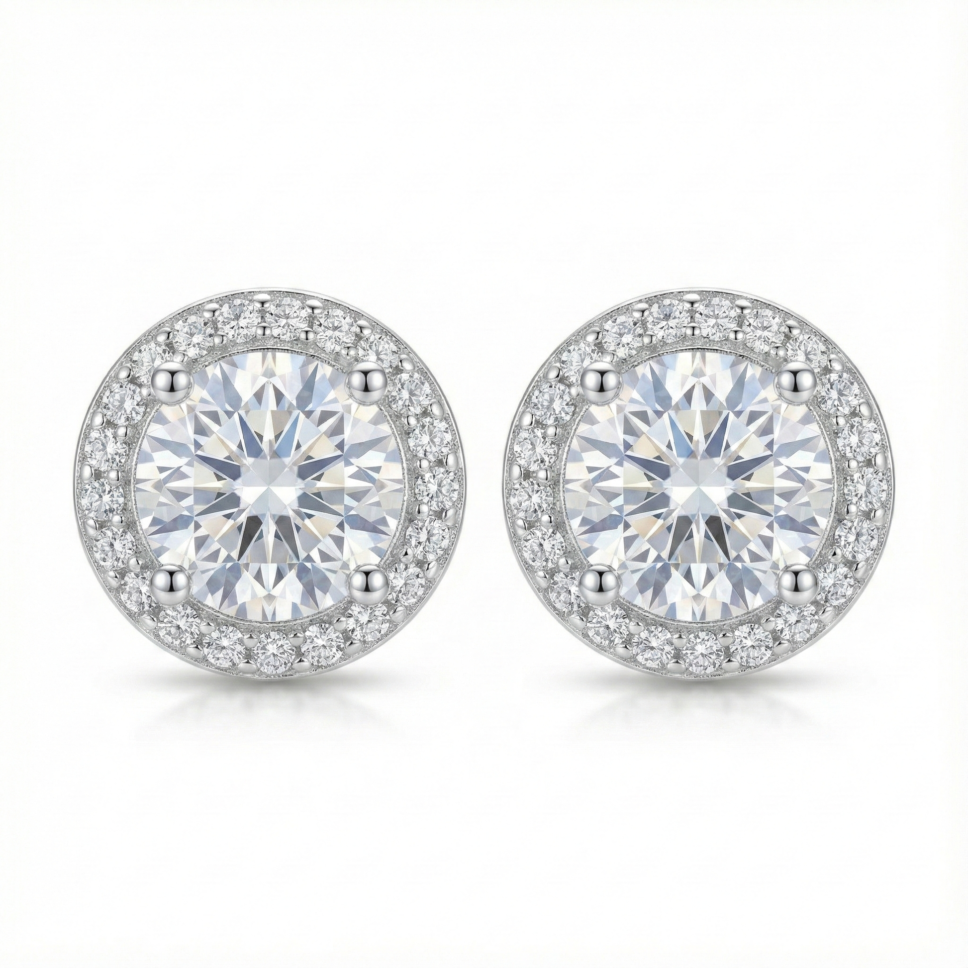 2️⃣ The Design: These exquisite round stud earrings feature a large, brilliant-cut central stone, securely held by four silver prongs. This dazzling center is entirely framed by a perfect halo of smaller, closely set pave stones, which amplify the sparkle and size of the center stone. The entire setting is crafted in a bright, polished silver finish.