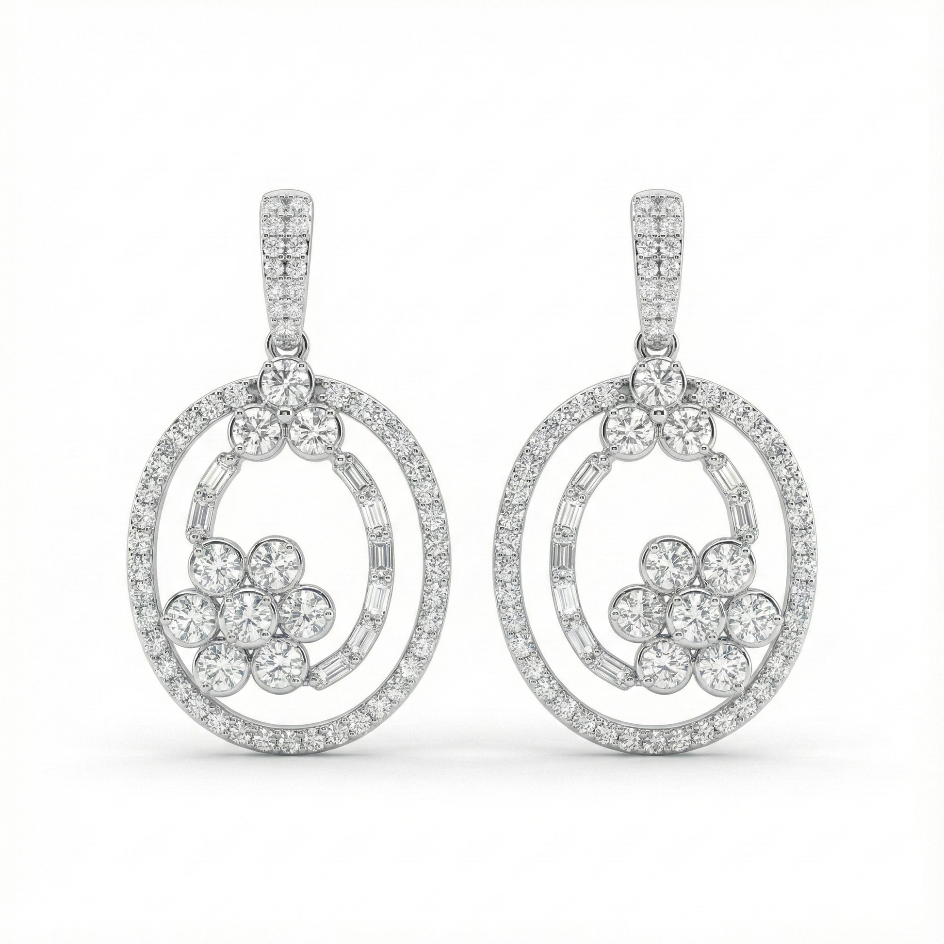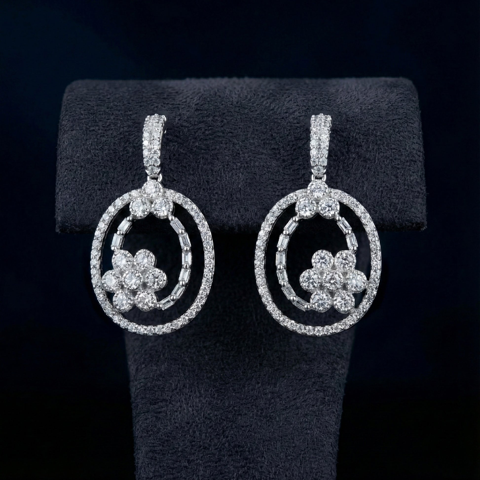 2️⃣ The Design: These magnificent drop earrings begin with a secure stud post completely covered in pave-set stones. Suspended beneath is a large, elaborate oval drop. The outer edge of the oval is lined with pave-set stones. Inside, the design features a clustered floral motif composed of round brilliant-cut stones and a swirl of baguette and round stones. All the gemstones are clear and the entire setting is in a polished silver finish.