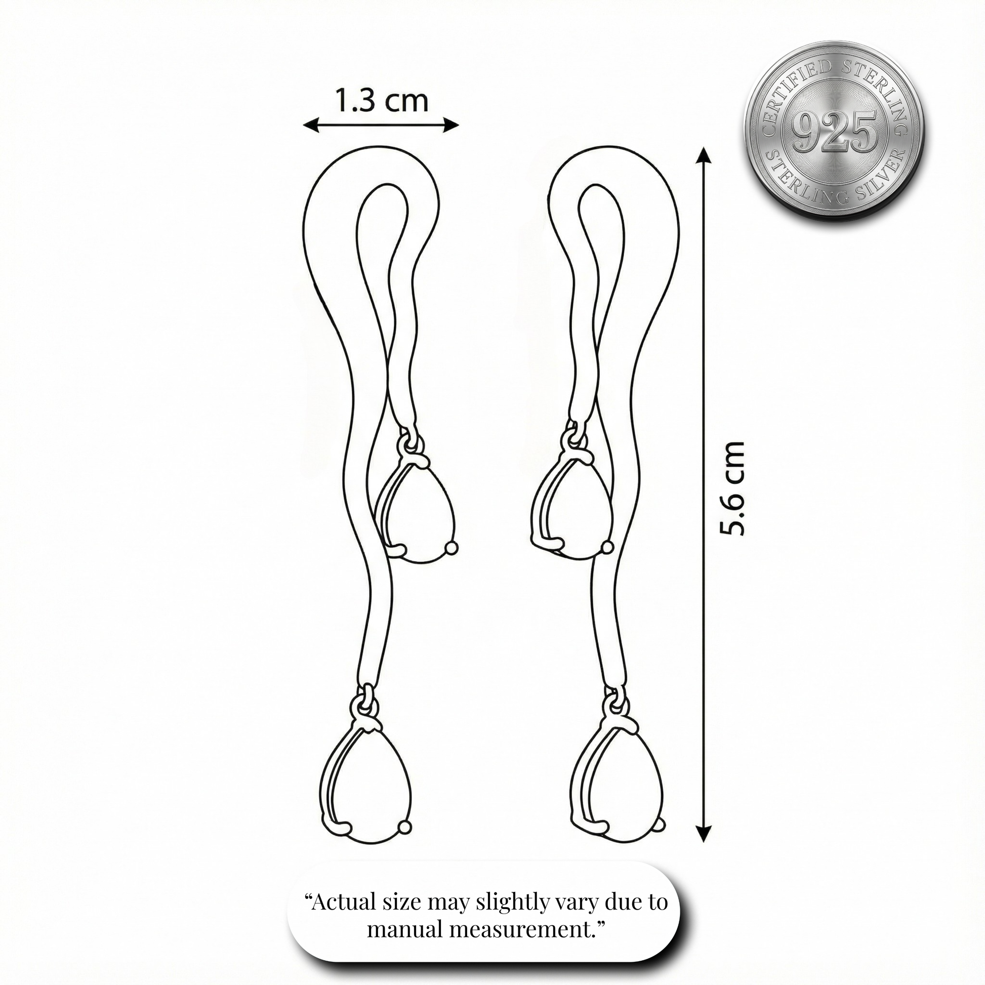 2️⃣ The Design: These stunning, long drop earrings feature a dramatic S-shaped or wave-like contour. The top part of the wave curves over the ear and is entirely covered with a dense setting of small, sparkling pave stones. The lower portion of the wave is a polished silver line from which two clear, brilliant teardrop-shaped gemstones are suspended, one mid-way and one at the very bottom, maximizing movement and reflective brilliance.