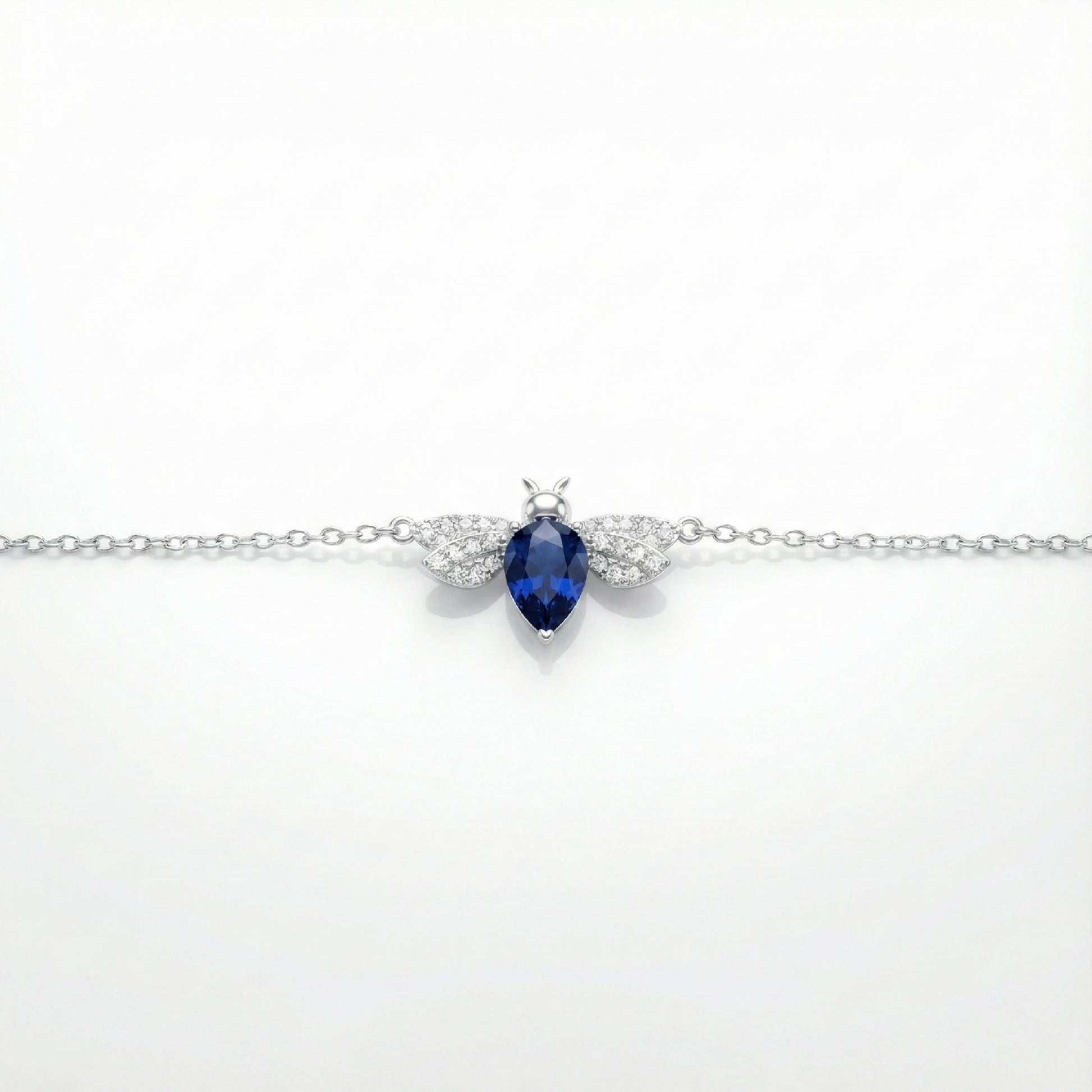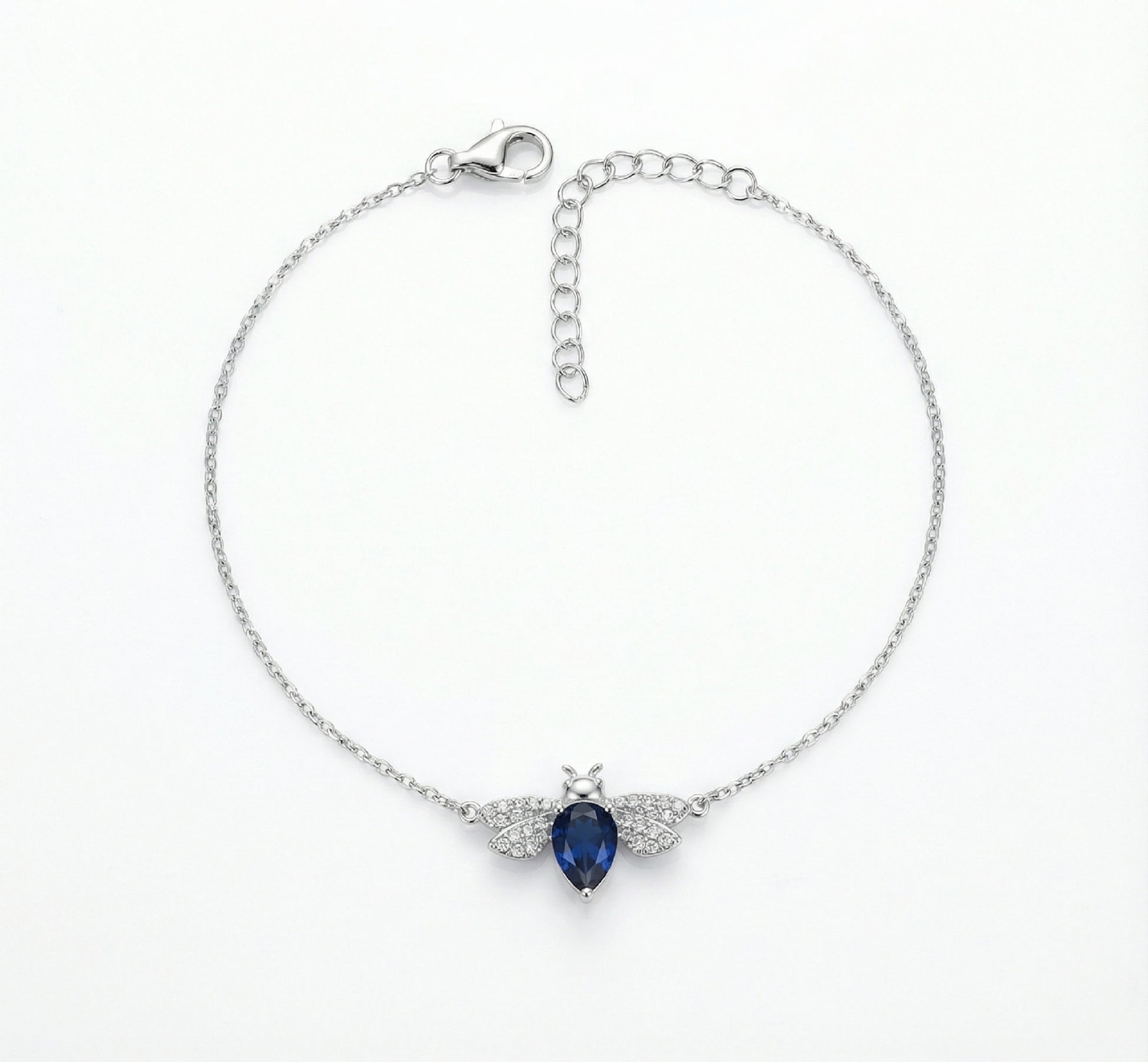 This exquisite 925 silver bracelet features a stunning bee motif crafted with a vibrant blue sapphire-tone centerpiece and dazzling CZ-studded wings. The delicate chain adds a soft feminine charm, while the high-polish 925 sterling silver finish gives it a luxurious sheen. Inspired by nature’s beauty, this bracelet brings together elegance and symbolism—representing strength, transformation, and positivity. Perfect for everyday wear or gifting, it adds a refined sparkle to any look.