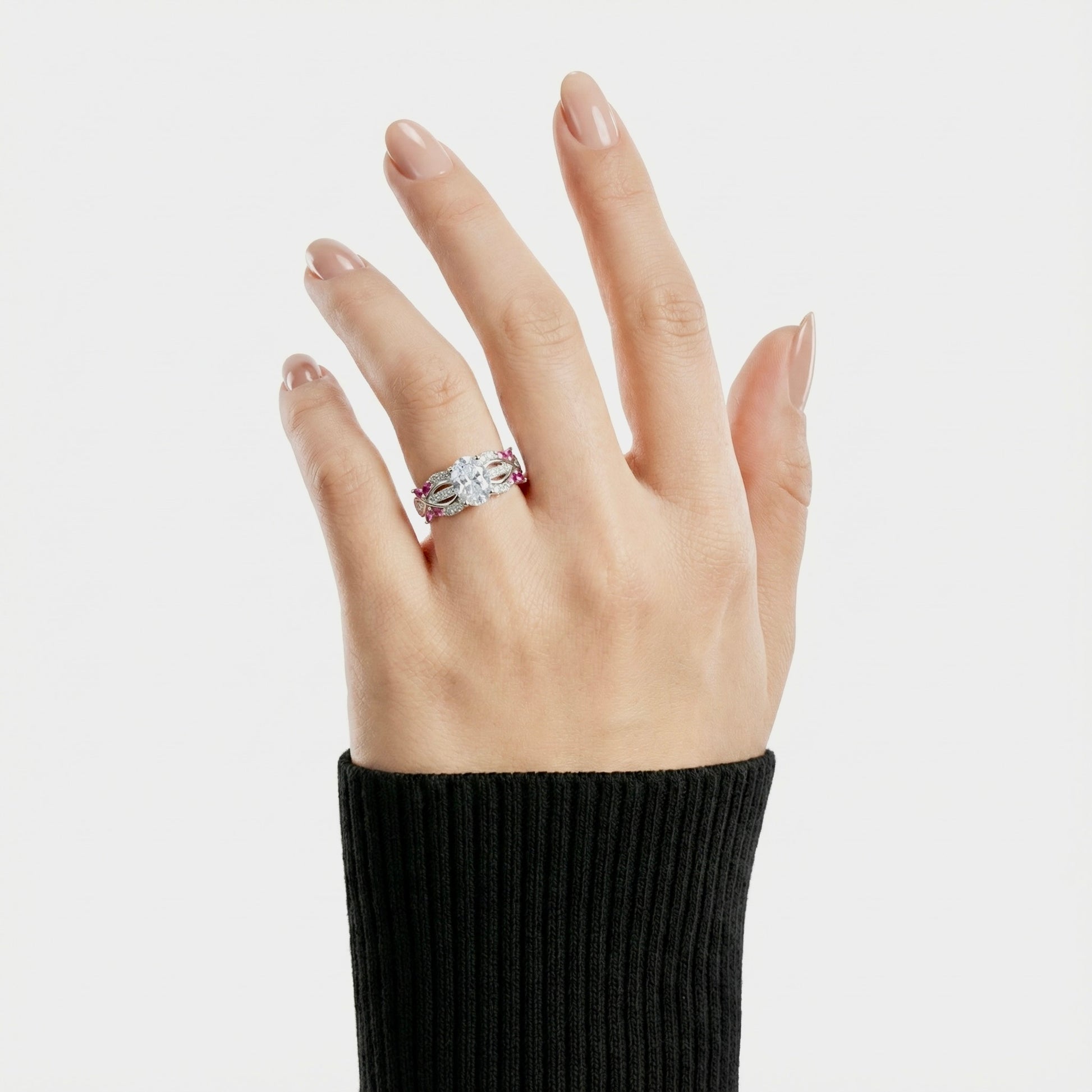 This elegant 925 silver ring features a sparkling oval centerpiece surrounded by shimmering cubic zirconia and beautiful pink marquise stones arranged in a floral pattern. The intricate design adds a feminine, luxurious touch, making it perfect for parties, gifting, and everyday elegance. Crafted in pure sterling silver, the ring offers a brilliant shine, smooth finish, and long-lasting comfort. A stunning choice for women who love unique and premium silver jewellery.