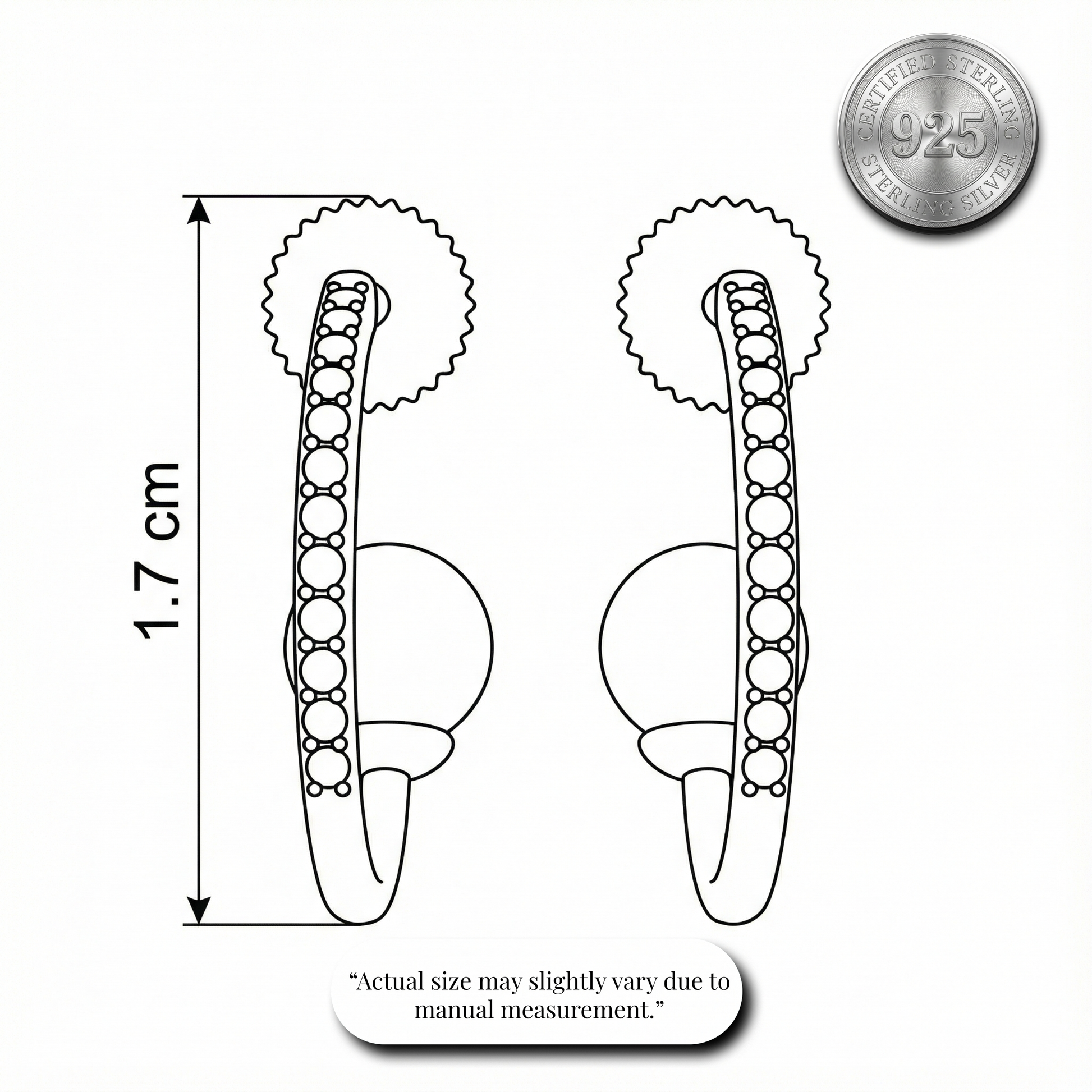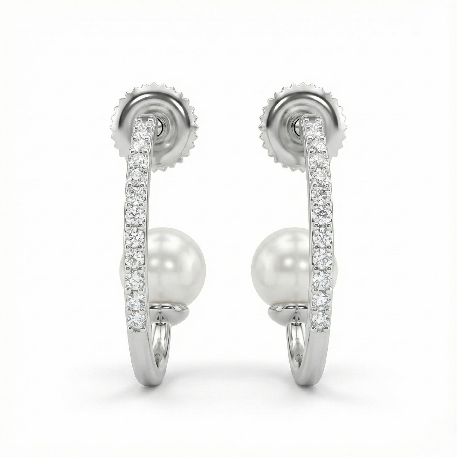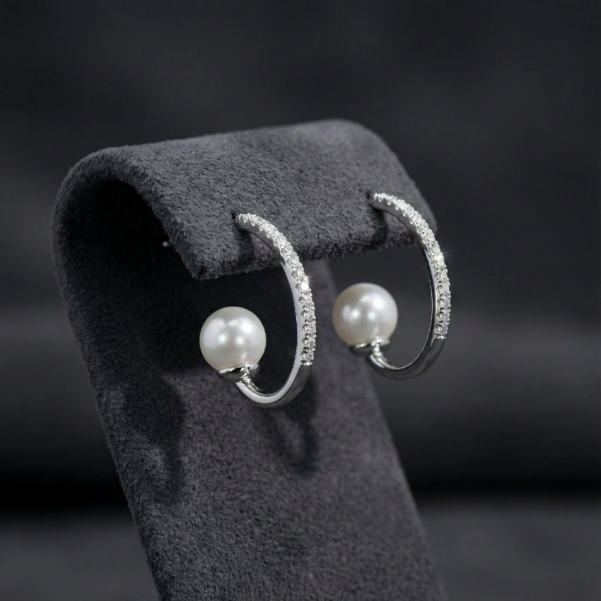 2️⃣ The Design: These contemporary half-hoop earrings feature a graceful open C-shape. The upper curve of the hoop is beautifully set with a single row of tiny, sparkling pave stones. At the lowest point of the hoop, a lustrous, roundwhite pearlis elegantly cradled, contrasting its soft glow with the sparkle of the stones and the polished silver setting. They fasten securely with a screw-back style post.