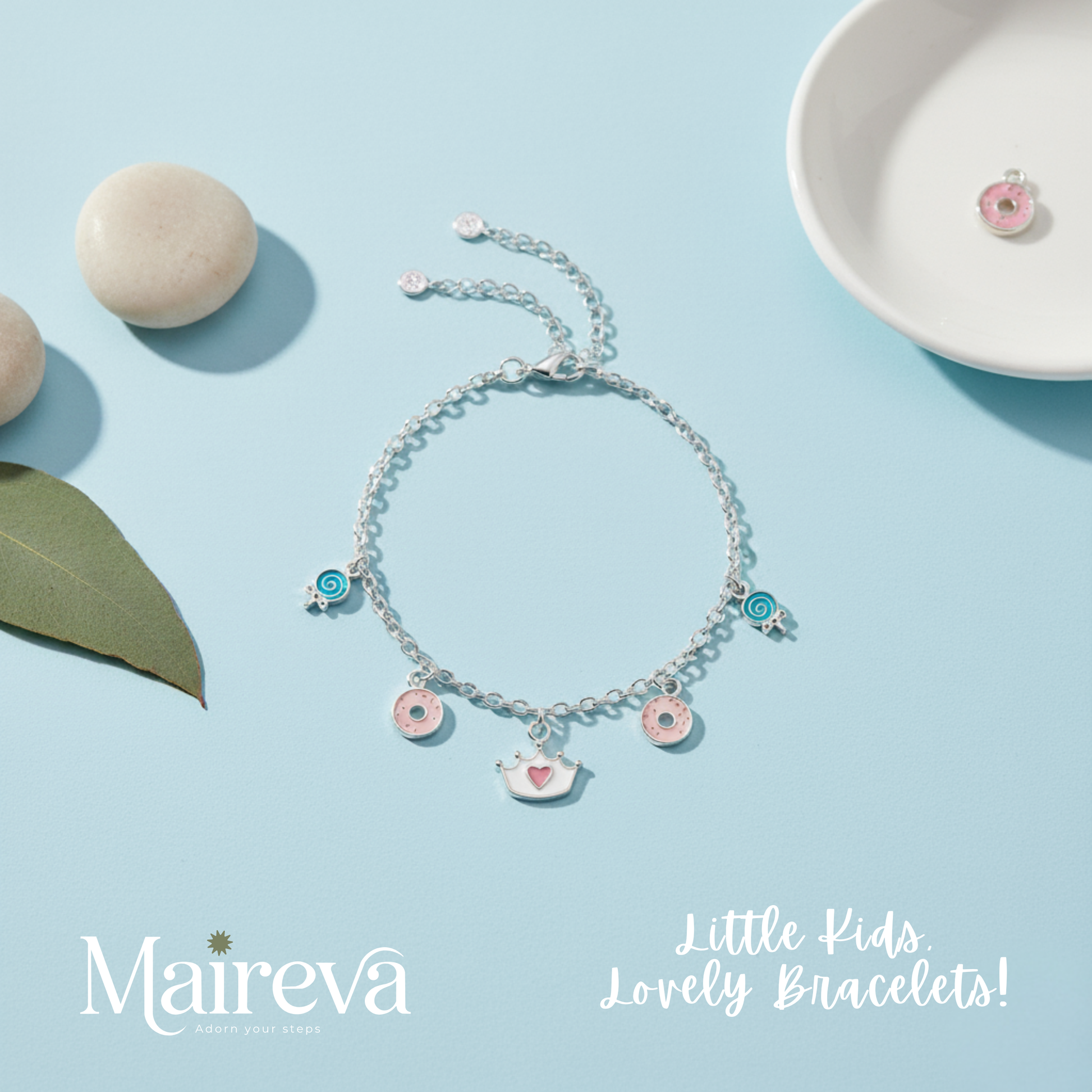 A delightful silver-tone charm bracelet to adorn your little one's wrist! This adorable piece features playful donut, candy, and princess crown enamel charms in soft pink and blue. The adjustable chain with a secure clasp is perfect for growing kids. Made with skin-friendly, non-allergic metal for safe daily wear. A charming, budget-friendly accessory and a wonderful return gift or birthday present for your gudiya (doll/daughter).